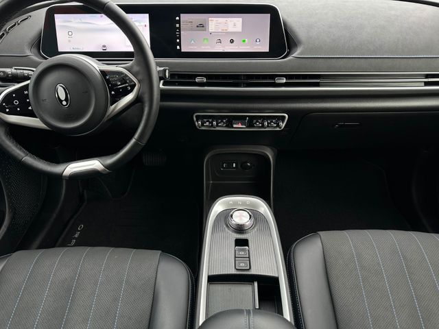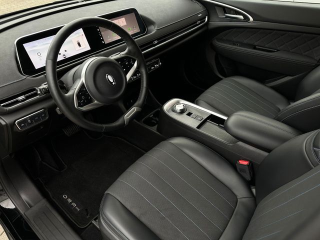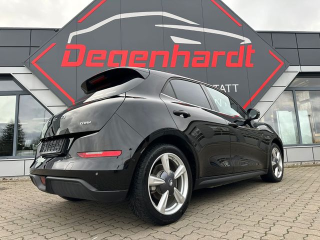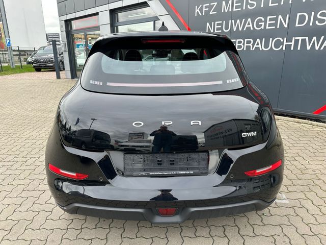 3. Bremsleuchte LED, 6 Lautsprecher, Airbag Beifahrerseite abschaltbar, Airbag Fahrer-/Beifahrerseite, Automatisches Antibeschlag-System, Außenspiegel elektr. verstell-, heiz- und anklappbar, Blinkleuchten LED in Außenspiegel integriert, Bluetooth-Schnittstelle mit Freisprecheinrichtung integriert, Bremsenergierückgewinnung (Rekuperationssystem), Coming-Home-Lichtfunktion, Dual-Bildschirm (10,25" Instrumentenanzeige + 10,25" Infotainment Touchscreen), Einparkhilfe hinten, Elektr. Bremskraftverteilung (EBD), Elektromotor 126 kW (cont. 60 kW), Fahrassistenz-System: 360-Grad-Rundumschutz (Surround-Kamerasystem), Fahrassistenz-System: Abbiege-Assistent (vorn), Fahrassistenz-System: Auffahrwarnsystem (Rear Collision Warning, RCW), Fahrassistenz-System: Ausstiegswarnung (Door Open Warning, DOW), Fahrassistenz-System: Ausweich-Assistent, Fahrassistenz-System: Fahrprofilauswahl (Fahrmodi), Fahrassistenz-System: Parkassistenzsystem (Park Assist), Fahrassistenz-System: Querverkehrs-Assistent Heck mit Bremsfunktion (Rear Cross Traffic Alert with Brake, RCTA-B), Fahrassistenz-System: Spurverlassenswarnung (LDW), Fahrassistenz-System: Spurwechselassistent (LCA), Fahrassistenz-System: Stauassistent (TJA), Fensterheber elektrisch vorn + hinten, Gepäckraumabdeckung / Rollo, Heckscheibe heizbar, Heizungs-/Klimaanlage: Wärmepumpe, HV-Batterie 63 kWh, Induktionsladeschale für Smartphone, Innenspiegel mit Abblendautomatik, Isofix-Aufnahmen für Kindersitz an Rücksitz, Karosserie: 5-türig, Kindersicherung, Klimaautomatik, Kopfstützen vorn und hinten verstellbar, Kühlergrill, Aktive Luftklappen, Ladekabel mit Typ 2-Stecker (Mode 2), Lenkrad (Kunstleder), Lenkrad heizbar, Lenksäule (Lenkrad) höhen-/längsverstellbar, LM-Felgen, Mittelarmlehne hinten mit Getränkehalter, Navigationssystem, Nebelschlussleuchte, Notrufsystem (eCall), One Pedal Drive (elektronisches Gaspedal),Parkbremse elektrisch mit Auto-Hold-Funktion, Radioempfang digital (DAB+), Reifen-Reparaturset, Rücksitzlehne geteilt/klappbar (60:40), Scheibenwaschdüsen heizbar, Scheinwerfer mit Begrüßungsfunktion (Welcome Light), Seitenairbag vorn, Seitenairbag vorn mitte (Center-Airbag), Service-System: Gesichtserkennung, Sitz vorn links elektr. verstellbar (6-fach), Sitz vorn rechts elektr. verstellbar (4-fach), Sitzbezug / Polsterung: vegane Leder-Optik schwarz, Sitzheizung vorn, Sonnenblenden mit Spiegel, Sprachassistent Hello Ora, Steckdose (12V-Anschluß) vorn, Traktionskontrolle (TCS), Türentriegelung automatisch (bei Unfall), Türgriffe außen Wagenfarbe, USB-Anschlüsse vorn und hinten, Verglasung hinten abgedunkelt (Privacy Glass), Vorhangairbag vorn und hinten, Warnanlage für Sicherheitsgurte